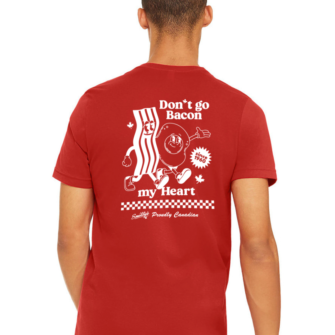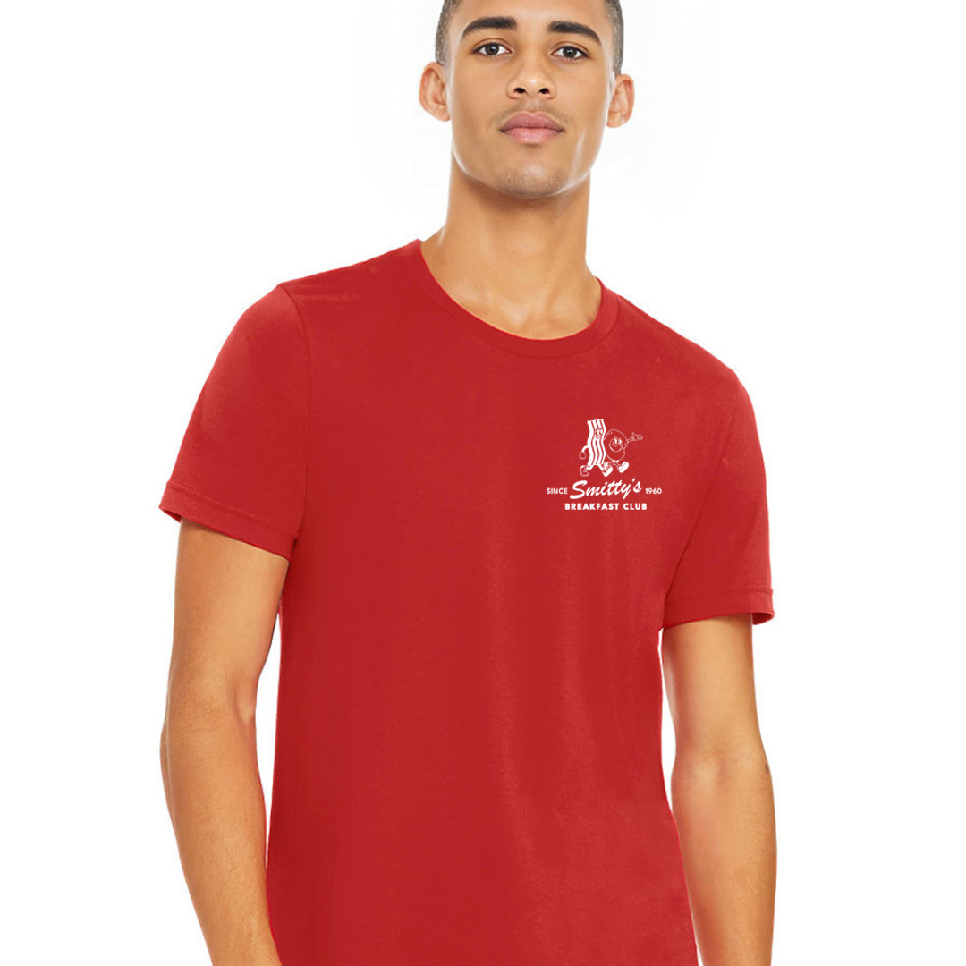 Join the Smitty’s Breakfast Club with this bold red graphic tee. The front features a clean club-inspired crest, while the back drops a playful retro print with the iconic “Don’t Go Bacon My Heart” design. Soft feel, modern fit, and a cheeky streetwear edge.