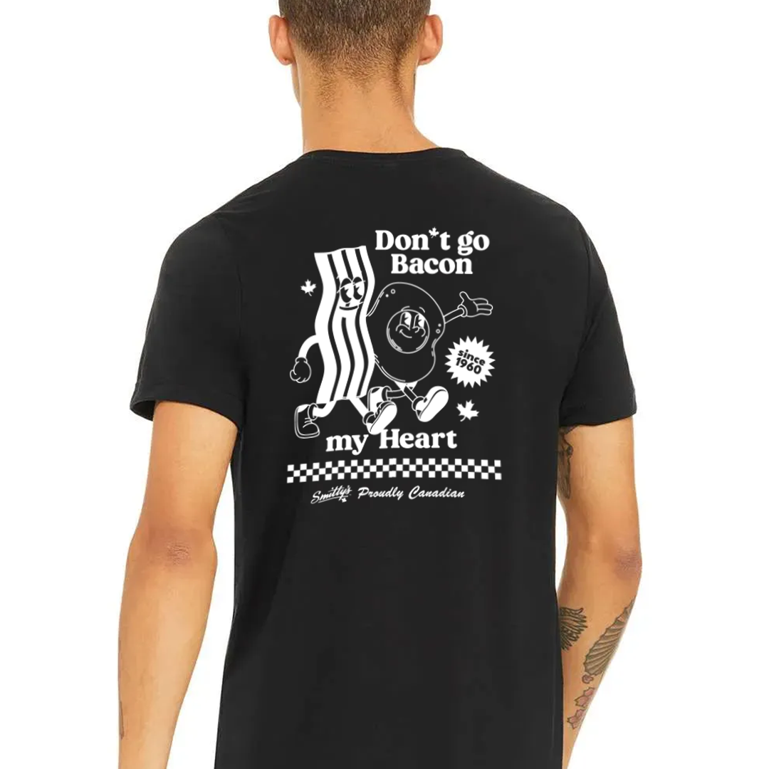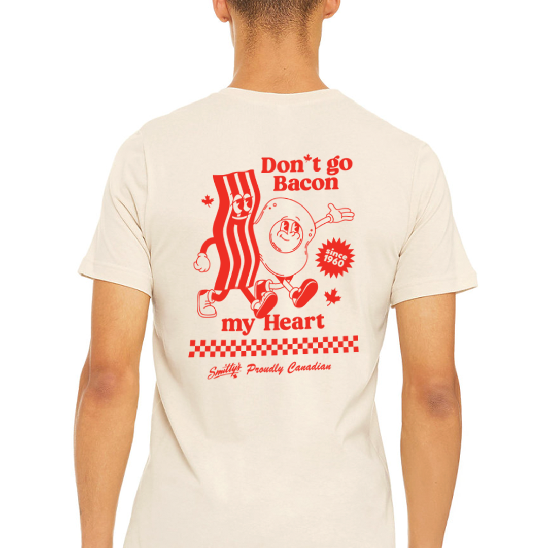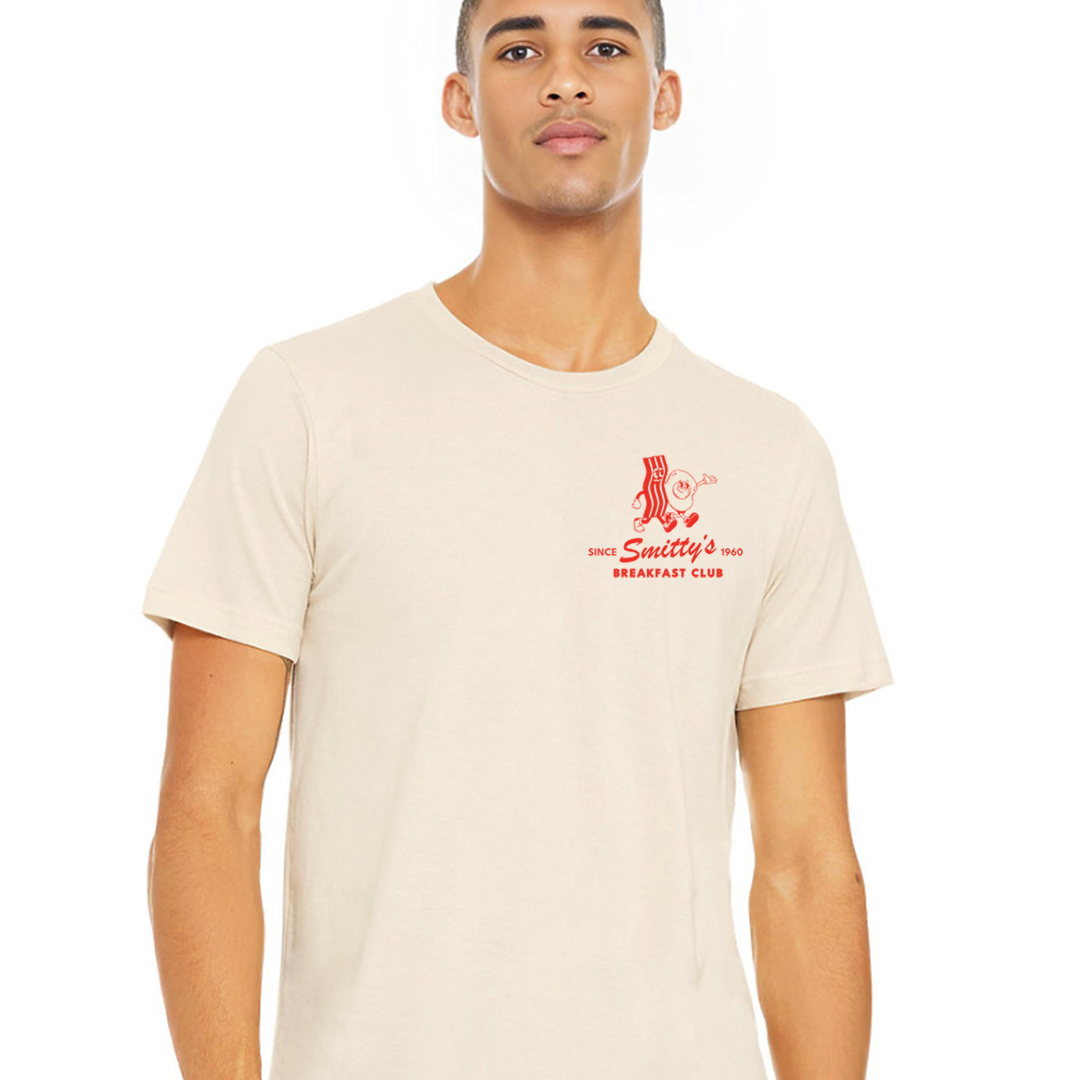 Join the Smitty’s Breakfast Club with this bold graphic tee. The front features a clean club-inspired crest, while the back drops a playful retro print with the iconic “Don’t Go Bacon My Heart” design. Soft feel, modern fit, and a cheeky streetwear edge.
